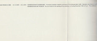 Travelled to Hämeenlinnan Taidemuseum and Hämeenlinna Art Museum, Hämeenlinna, Finland, 10 December 2000 – 25 February 25 2001. On this occasion, Friðfinnsson was awarded with the Ars Fennica Prize 2000, conferred by Jean-Christophe Ammann.