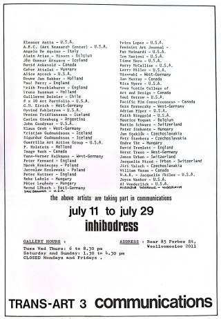 Founded in 1971 by Mike Parr, Peter Kennedy, and Tim Johnson, Inhibodress was the first artist-run space in Sydney dedicated to conceptual, installation, and performance art. Operating from a small space in Woolloomooloo, it became a vital node in an international network of avant-garde artists, exchanging works and documentation with artists across Europe, North America, and South America through mail art and correspondence. Communications Trans Arts 3 (1972) was the gallery's most ambitious international project, organised by Peter Kennedy and bringing together around 65 artists from across the world. Works arrived by post as photographs, postcards, sound tapes, and documentation.
