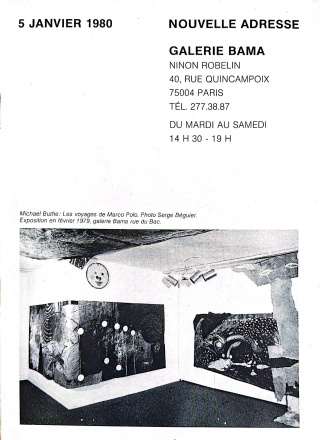 Founded in the early 1970s by Ninon Robelin and co-directed from 1976 by Claudine Papillon, Galerie Bama was a leading Parisian platform for Fluxus and international avant-garde art, presenting among others Joseph Beuys, Sigmar Polke, Dieter Roth, Dorothy Iannone, Robert Filliou, and Marcel Broodthaers. Hreinn Friðfinnsson first exhibited there in a group show in March 1977, followed by a solo in October 1979.