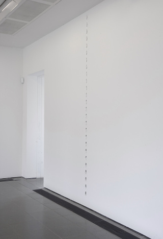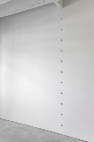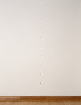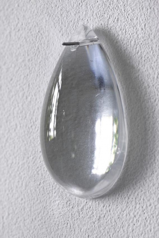 "I first came across this material, these crystal glass drops, in a flea market. I bought what was there and took them to my studio. At the time, I was working on wall sculptures, which I later called Night Islands, consisting of different materials. There is a nature element in these works. In one there are slates that have slightly violet tones and in the other the slates are black. In the first Night Islands work, I used about 20 of the drops. It’s often only afterwards that I start thinking about the motivation behind my work, and I think these drops represent the dew on the grass and on the earth in the early morning. The violet one has a gold leaf spiral, which represents the sun rise. Much later, in the 1990s, I was down in Marseille, where I used to go frequently for a certain project. I went into a shop there, which I believe was selling lamps and lights, and there I saw exactly the same drops. I bought a lot of them that day. Then the drops became an independent work, very different in nature from those sculptural works from 1979. I started putting them up in a vertical line on a wall and they’re simply titled according to the number of drops that are on the wall, for example 12 Drops, 21 Drops and so on. They can be placed with different distances between them, so if you have short distances it’s a faster line, and with long distances it’s a slow line. Now, they have no external referent whatsoever: they’re simply drops and the number of drops is both the material and its content."